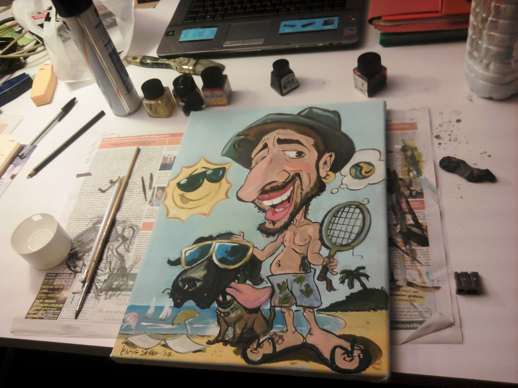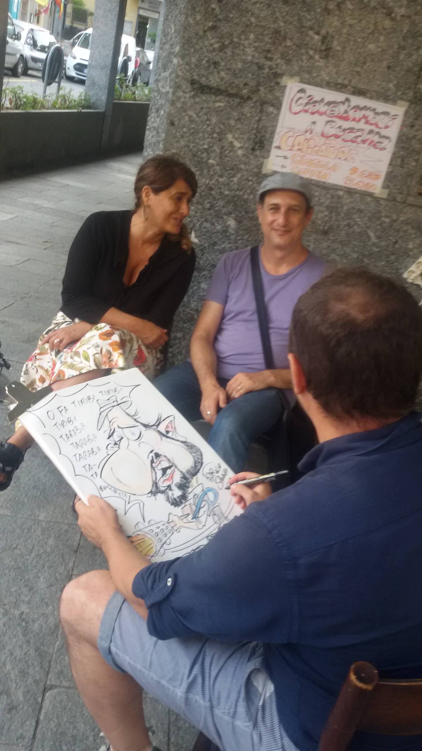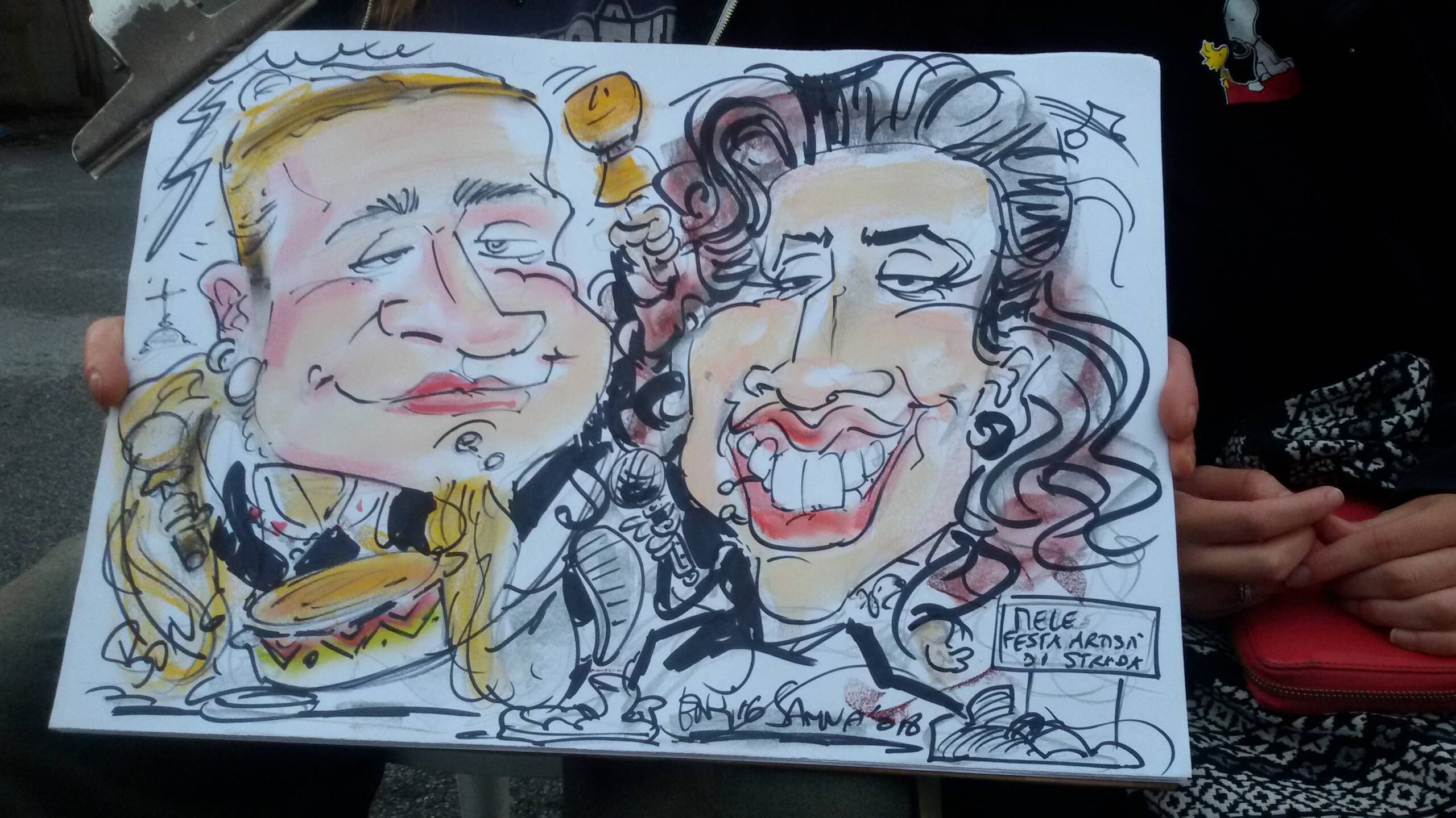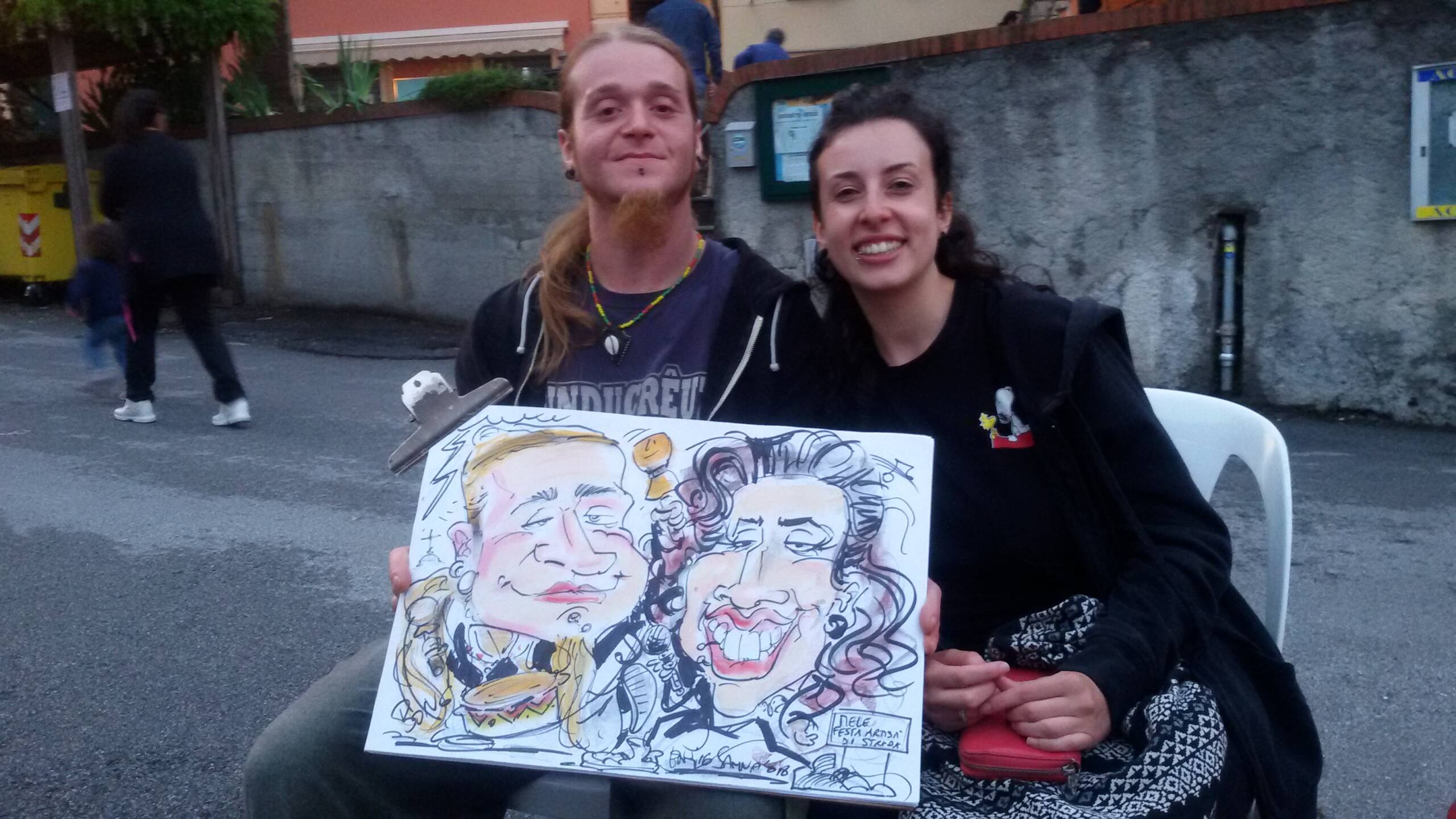 Ho iniziato a disegnare in feste di paese e per strada quasi per gioco delle caricature che dapprima regalavo a chi accettava di posare per aver in cambio un suo disegno grottesco. vedendo riscuotere un discreto successo, cercai di implementare la formula investendo in materiali piu’ adatti per potermi proporre in situazioni più strutturate come matrimoni e feste private. introdussi carboncino e gessetti colorati che attualmente uso e che si trovano in negozi di belle arti; i pastelli morbidi Rembrandt sono ottimali per infondere al disegno realismo. ciò rende l’effetto comico che scaturisce dall’aggiunta di fumetti e scritte ancora più pieno. per delineare i contorni ho introdotto via via dei markers indelebili che hanno evidenziato meglio contorni e particolari.